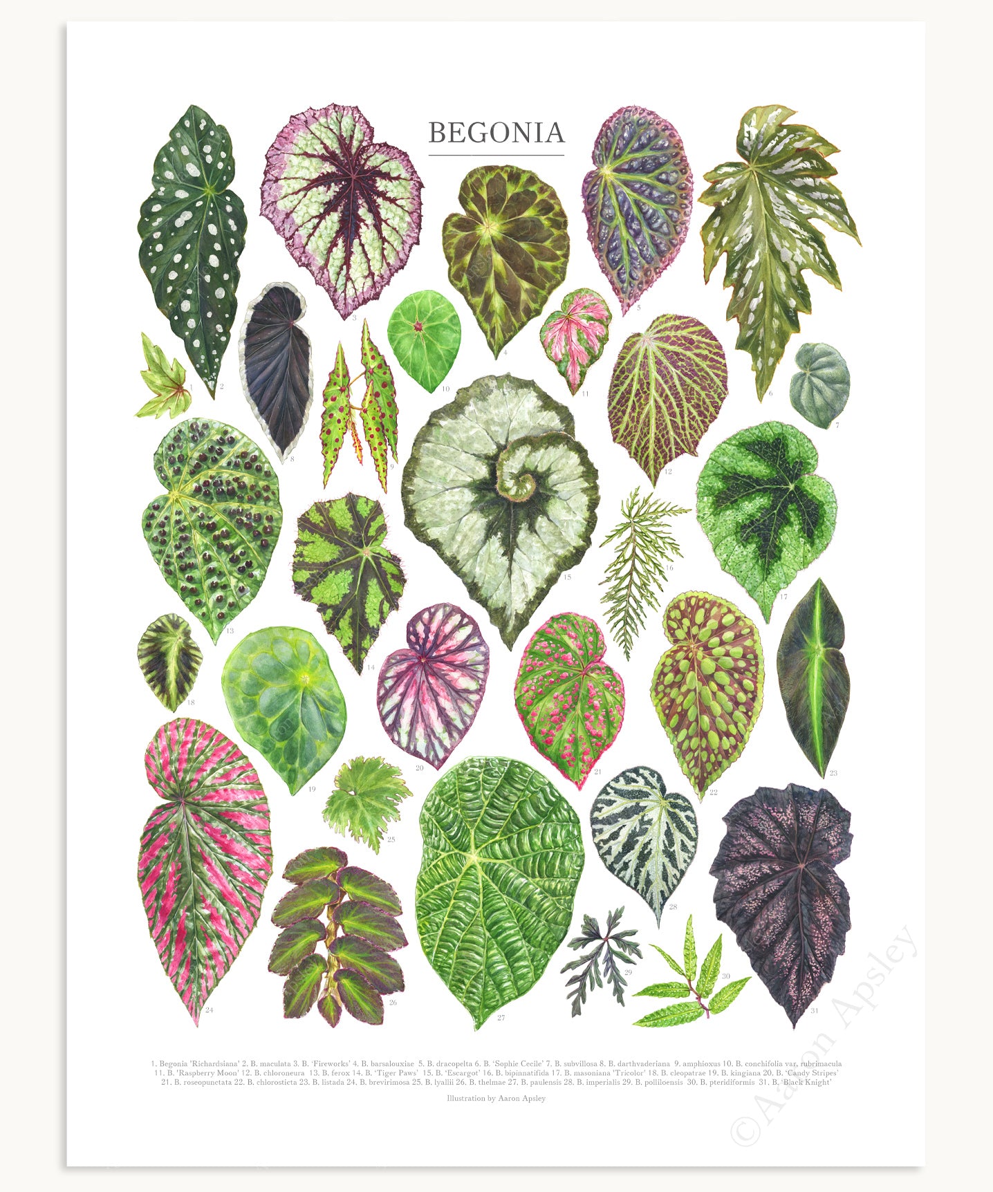 Thirty-one watercolor illustrations of foliage from the Begonia genus. Each species or hybrid is numbered and identified at the bottom of the image.