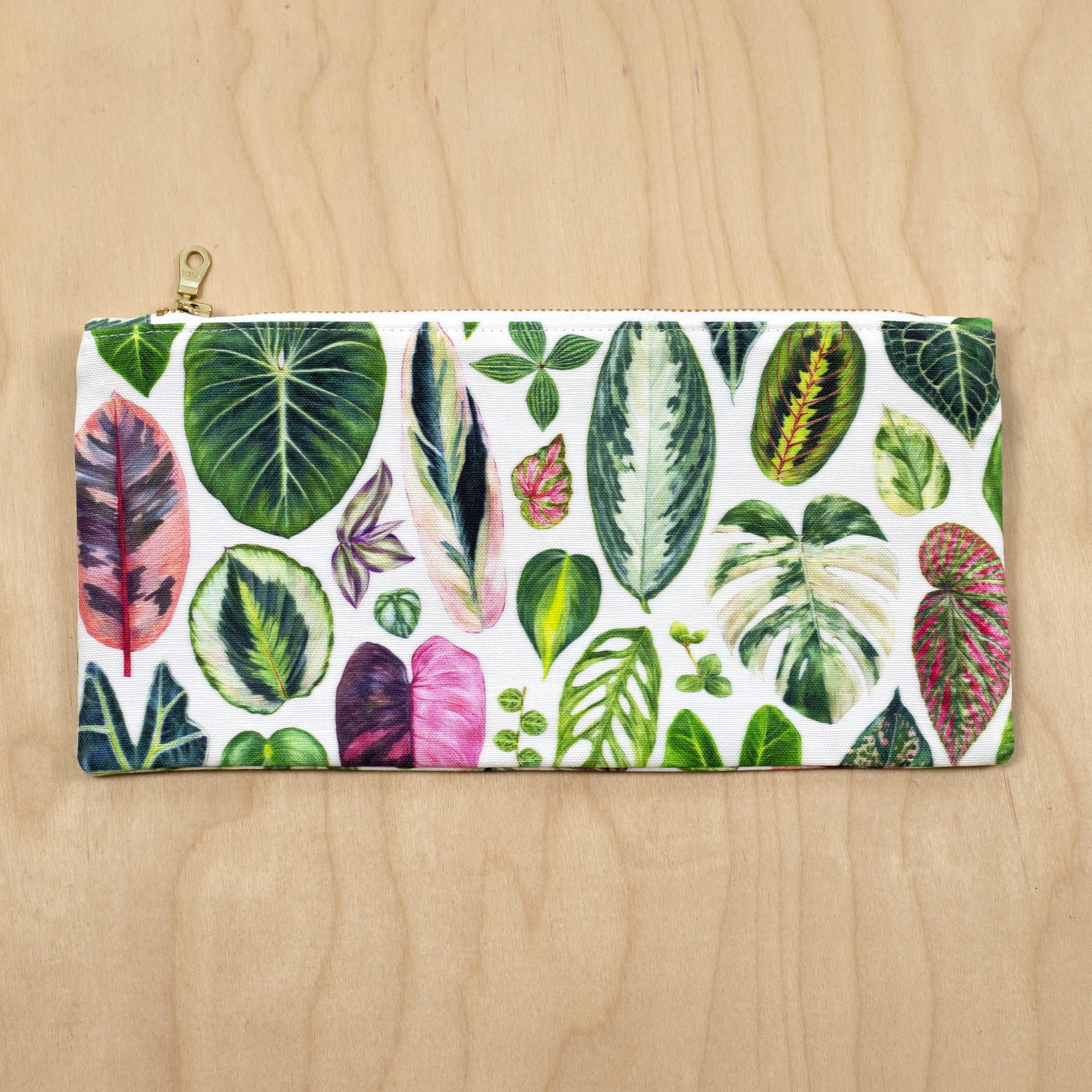 This zipper pouch features foliage from various houseplants.. All illustrations were originally painted by Aaron in watercolor.