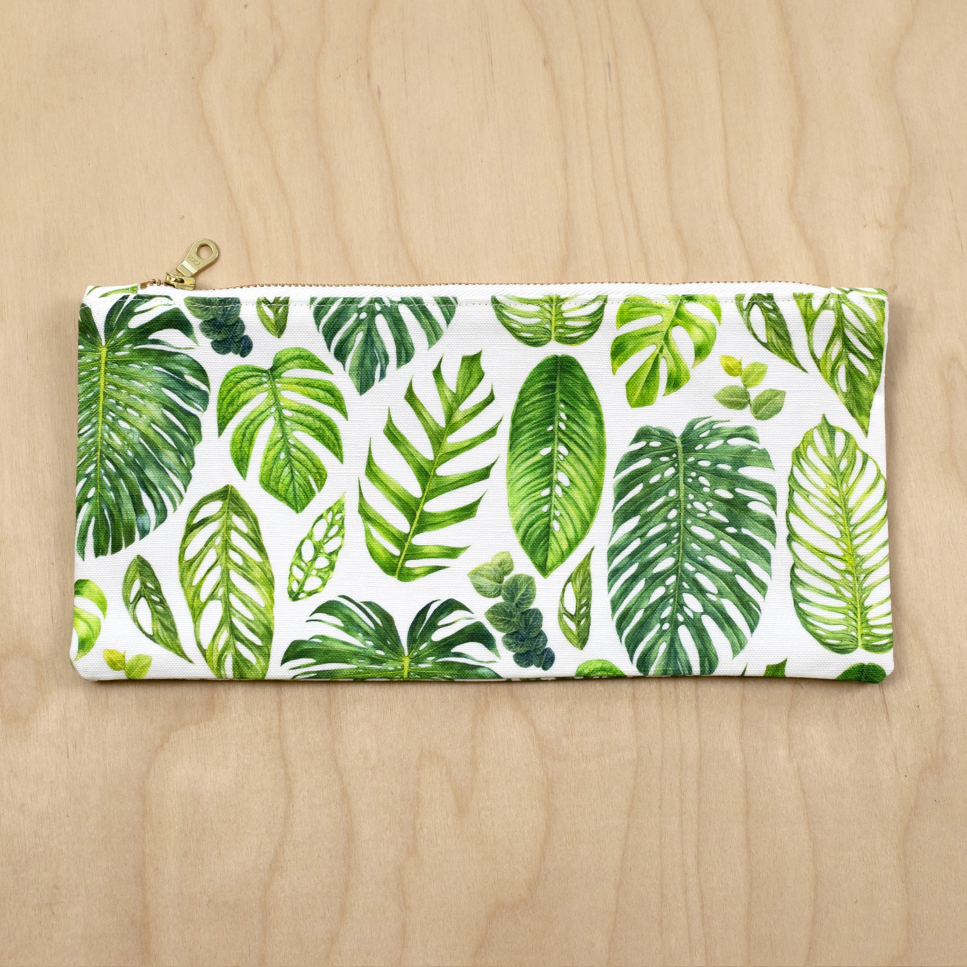 This zipper pouch features leaves of plants in the Monsteroideae tribe, including Monstera, Epipremnum, Amydrium, and Rhaphidophora. All illustrations were originally painted by Aaron in watercolor.