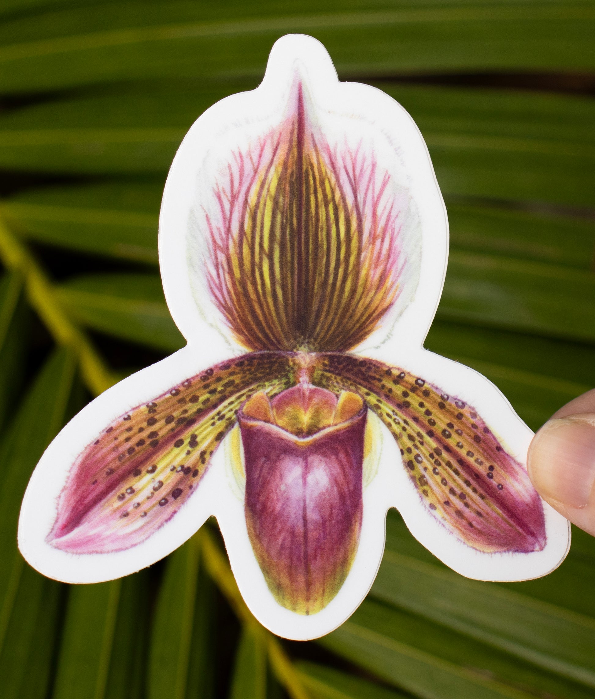A sticker of a Paphiopedilum Colbert slipper orchid flower. Made from durable clear waterproof vinyl.