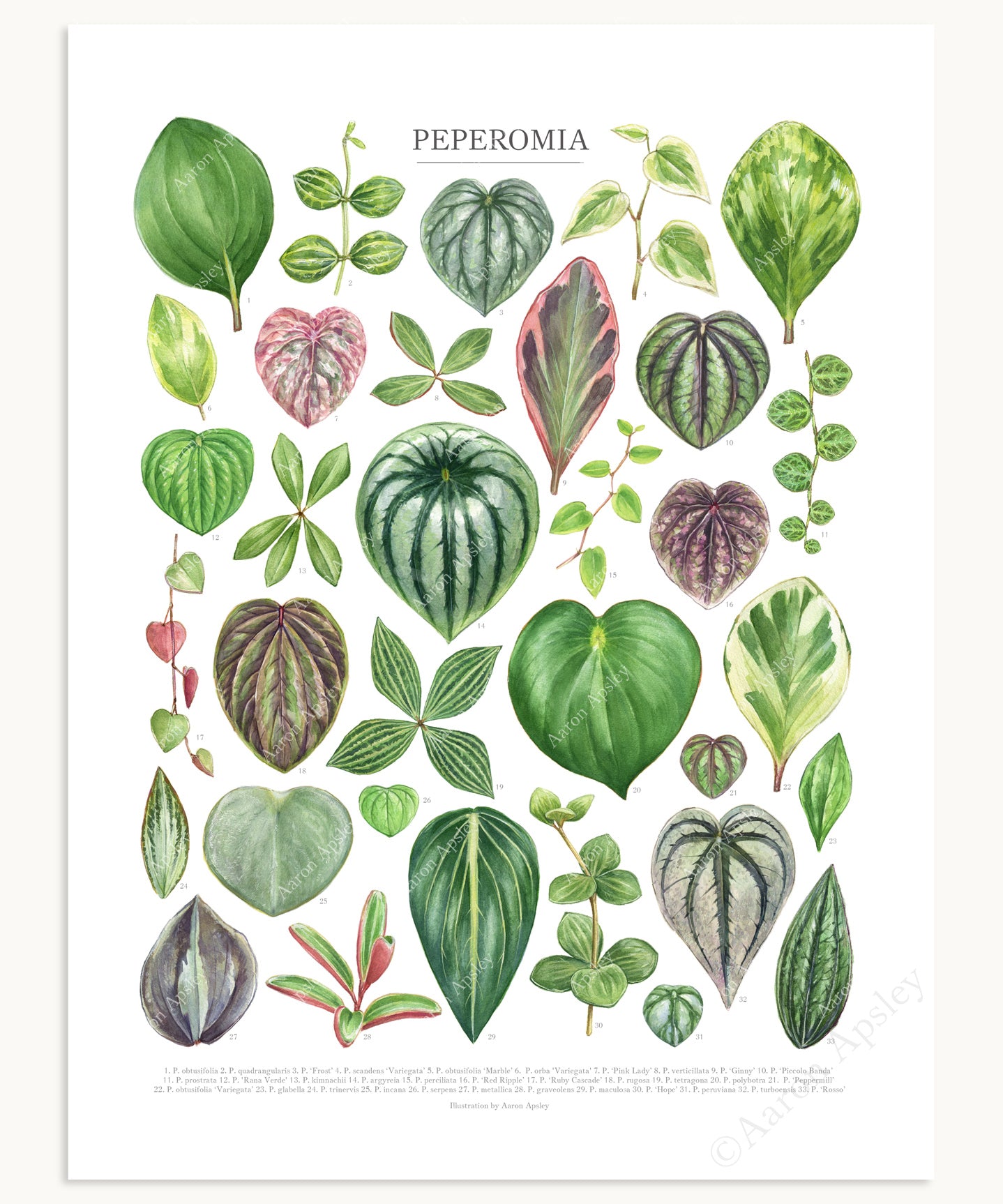 Thirty-three watercolor illustrations of Peperomia foliage.
