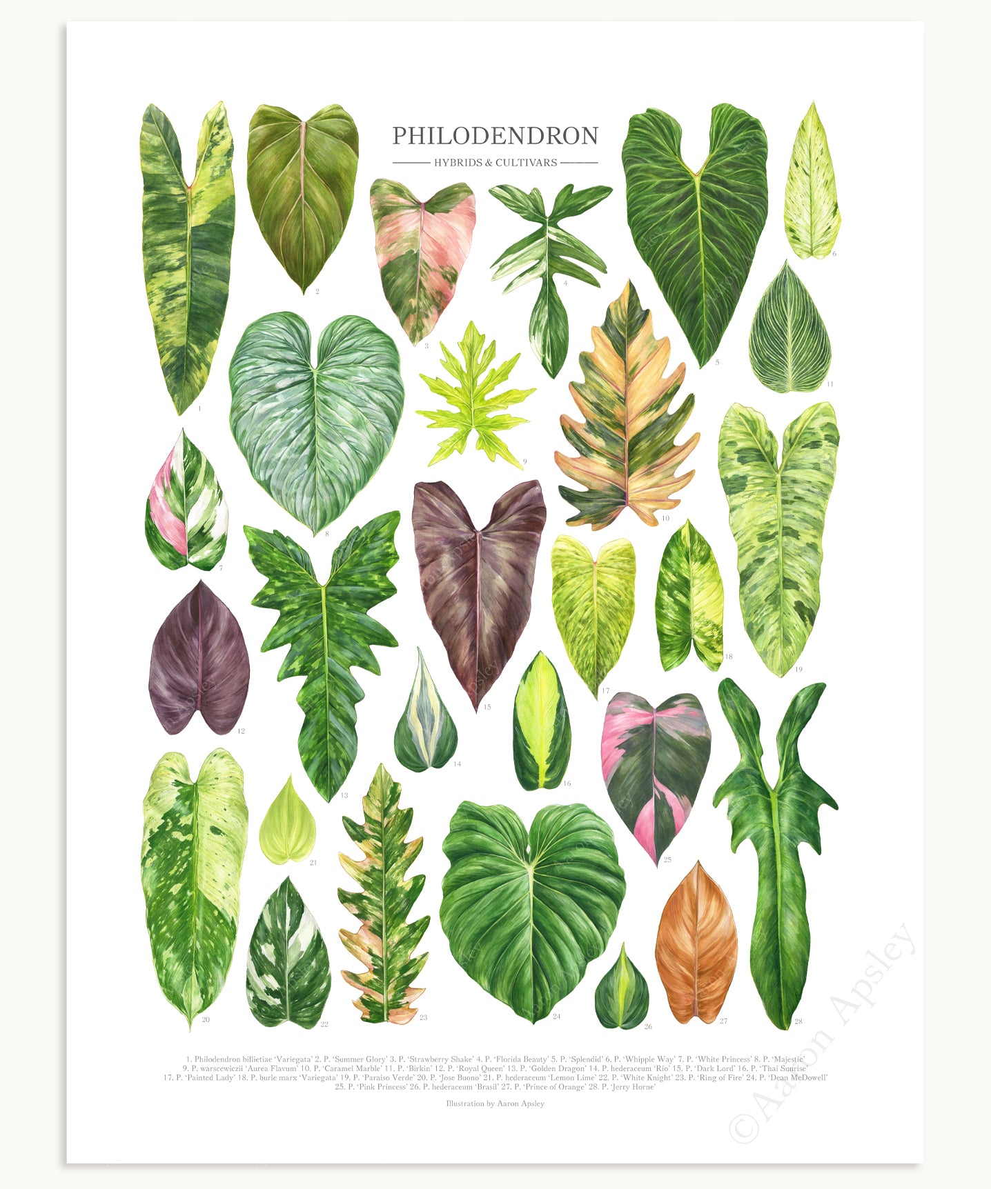 This print features twenty-eight watercolor illustrations of popular Philodendron hybrids & cultivars. Each variety featured on this print was originally painted in watercolor, using plants in my own collection as well as photos of plants I’ve seen growing here in Florida as my primary sources of reference. I sign each print individually and every order is shipped directly from my home studio. Thank you for supporting my work!