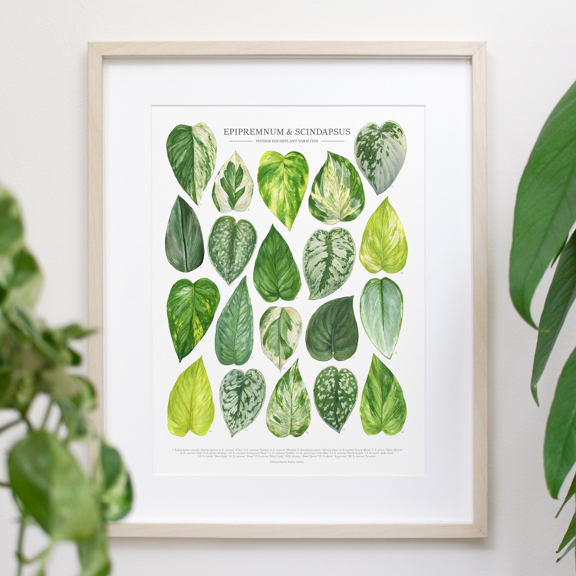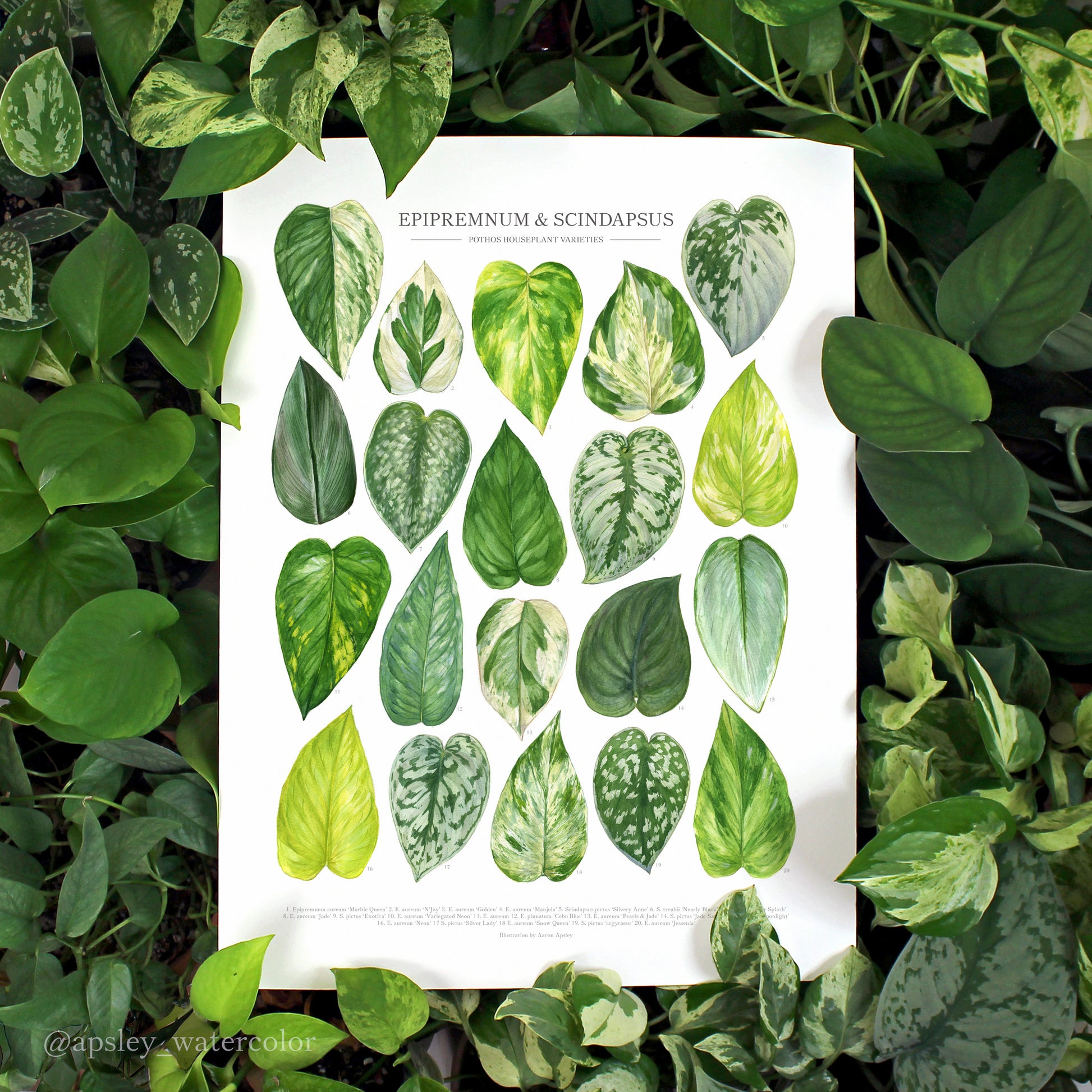 This print features twenty watercolor illustrations of foliage from different varieties of Epipremnum and Scindapus plants that are commonly known as "Pothos" plants. Originally from the tropics of Southeast Asia and Oceania, Epipremnum and Scindapsus are two closely related genera in the aroid family. The genera Pothos is in fact a separate group of aroids, and that name is no longer botanically correct for these varieties; however the shorter, easier to remember name "Pothos" seems to have stuck. These are some of the most popular and beloved tropical houseplants grown all over the world.