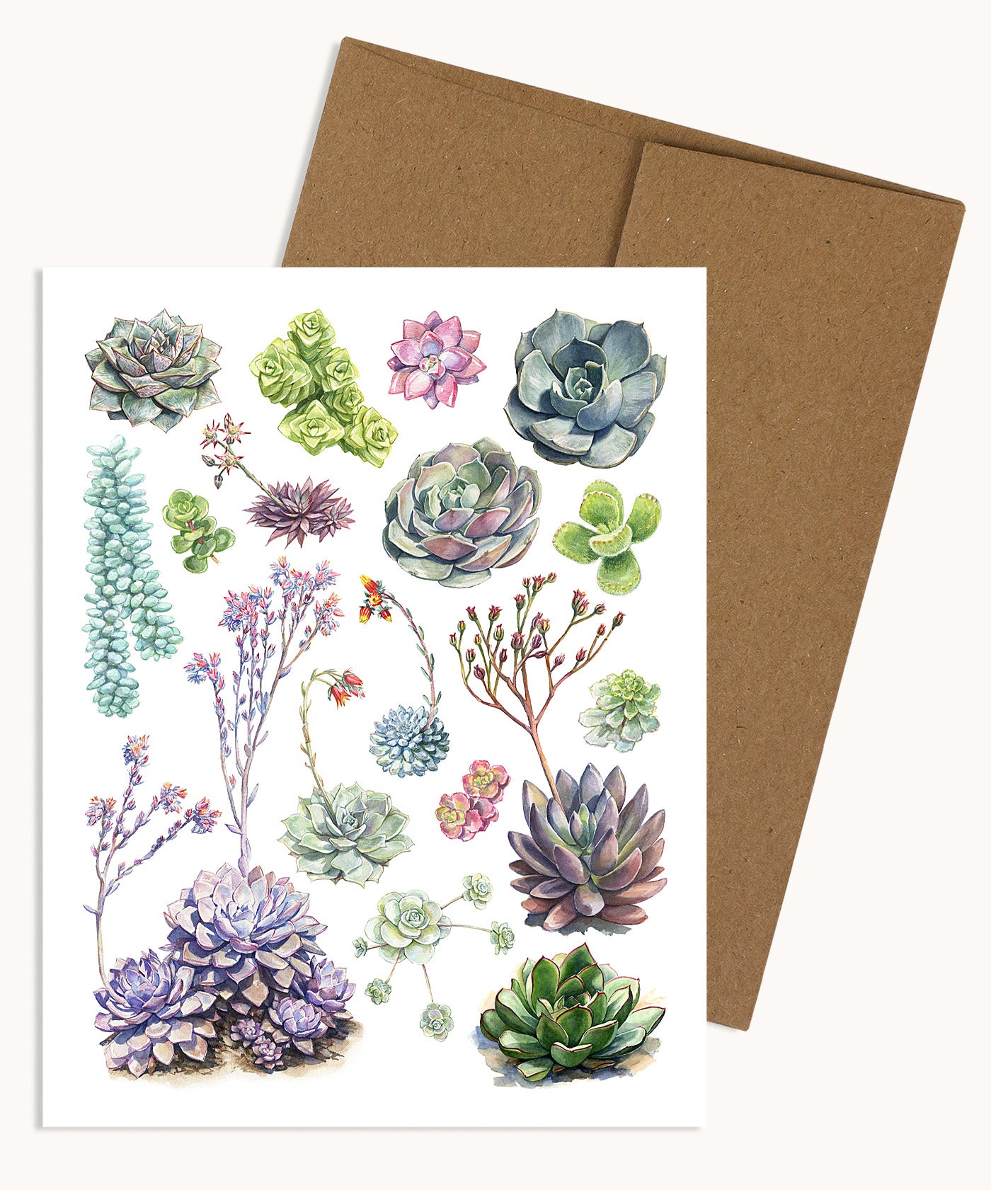 A collection of watercolor studies of plants in the Crassula genus, succulents that are commonly grown as houseplants.