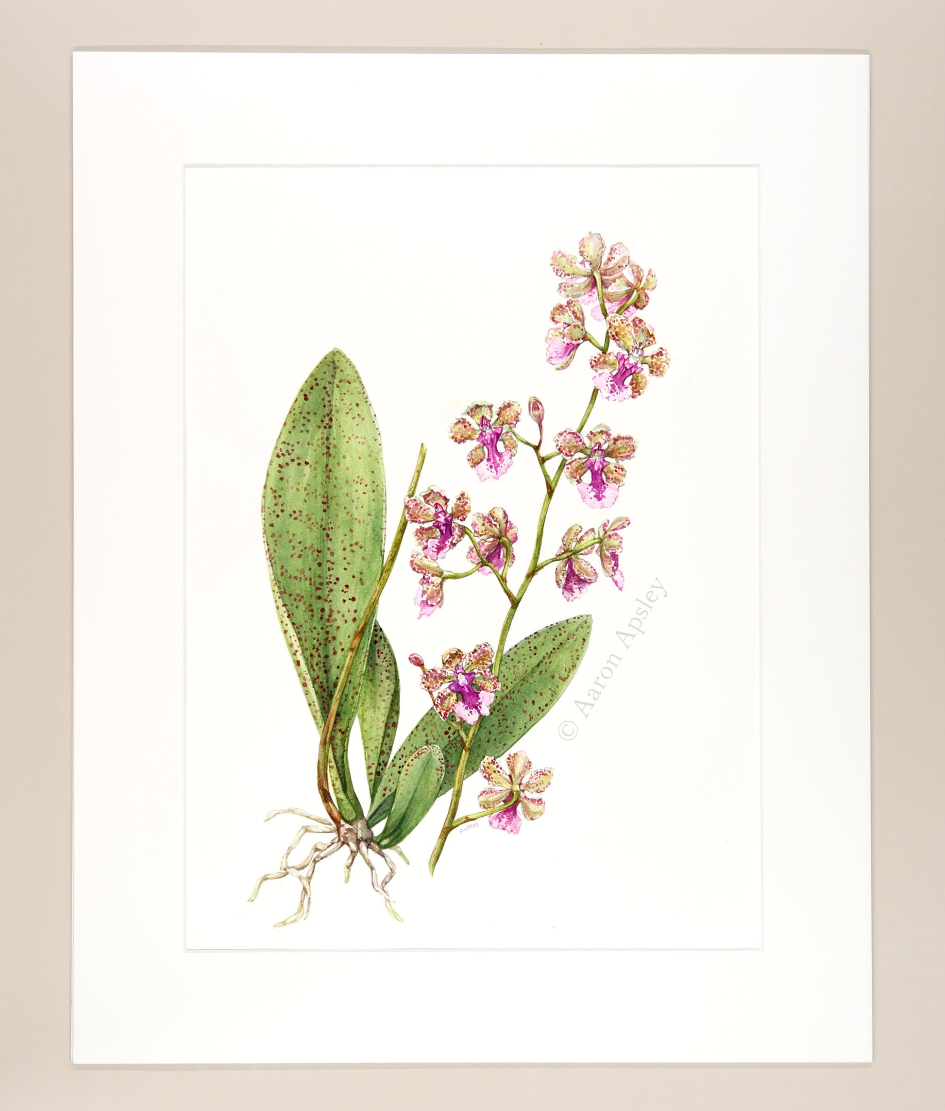 Study of a flowering Trichocentrum Ollie Palmer orchid, painted from one of my own blooming plants.